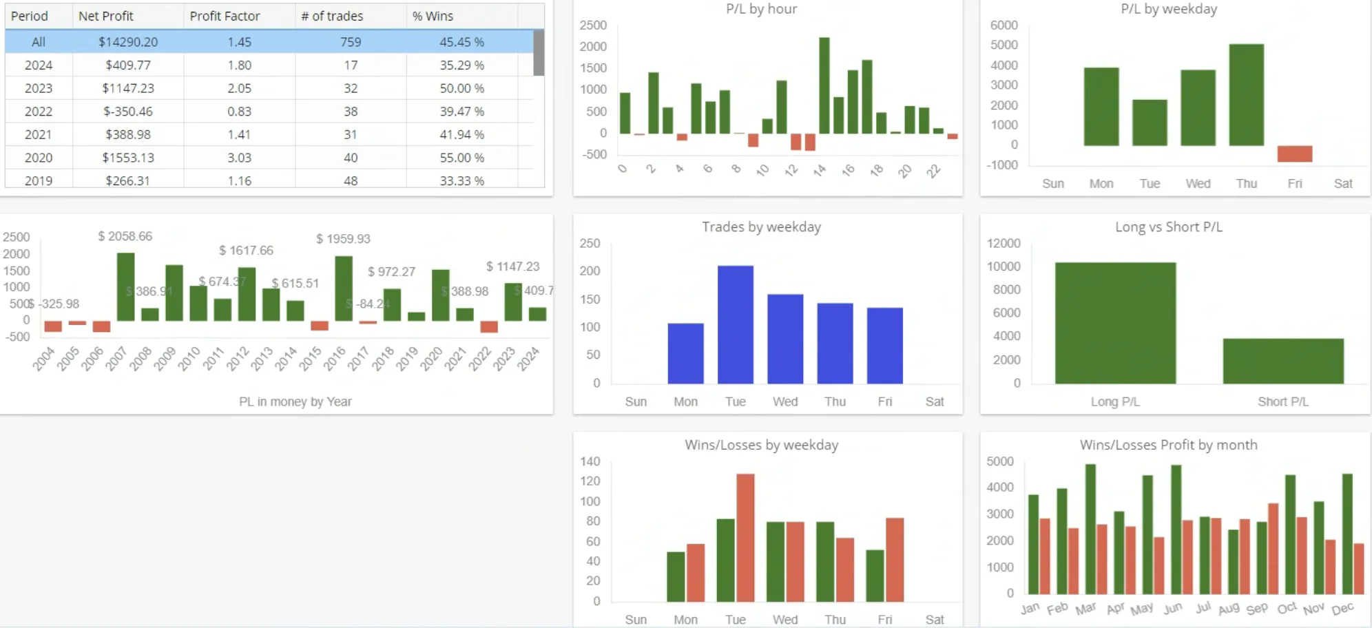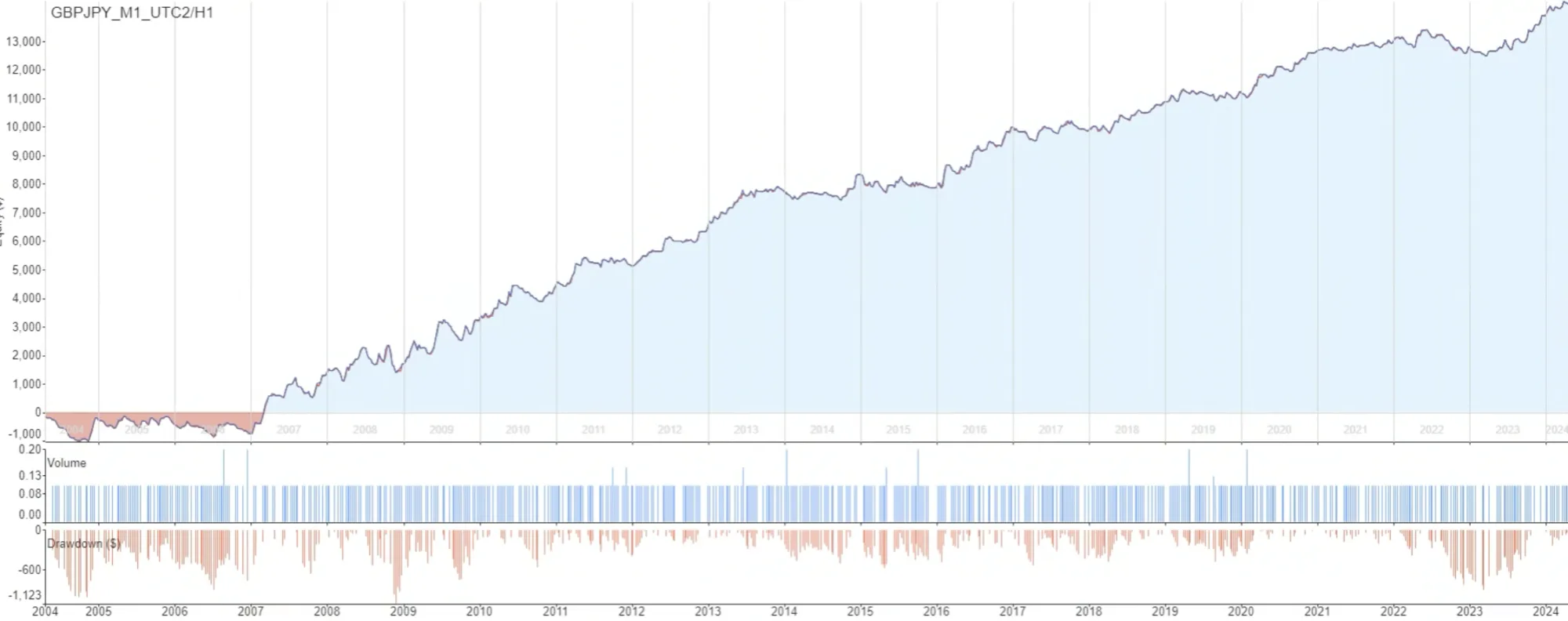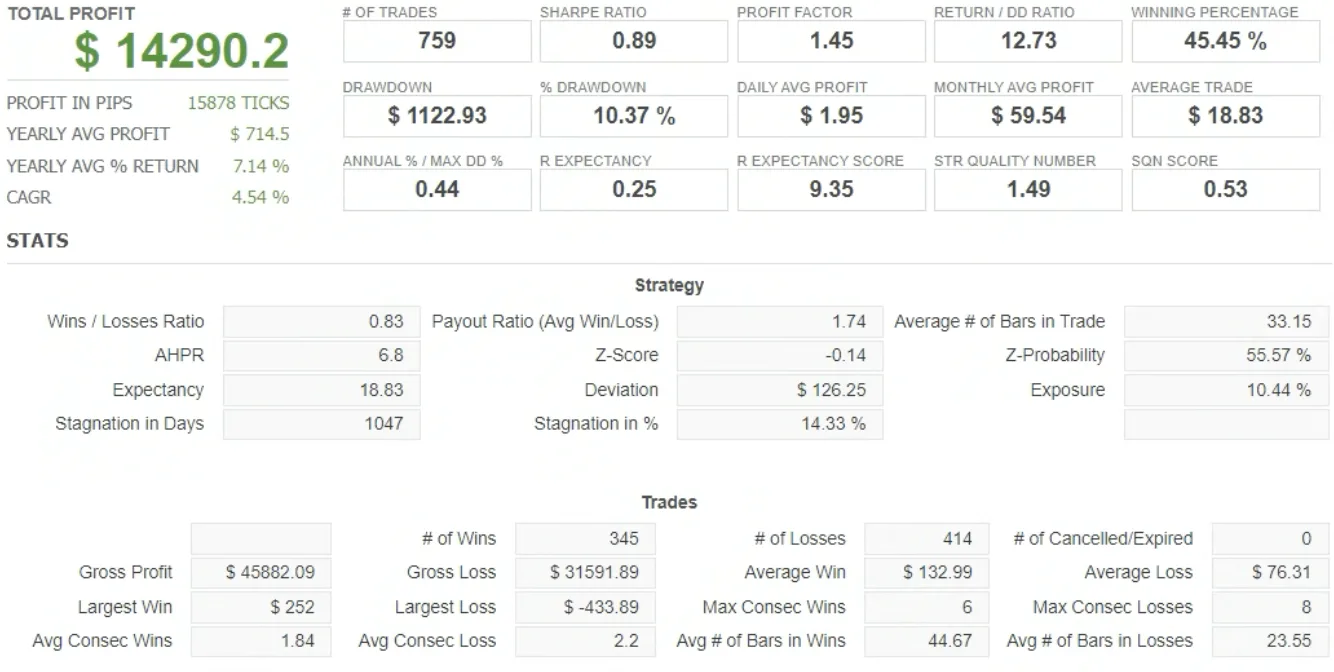 Risk management is volatility-adjusted through an ATR-based stop-loss, set to 3.3 × ATR(22), while the profit target is fixed at 280 pips. In addition, the strategy closes open positions on Friday at 21:00 to reduce weekend exposure.