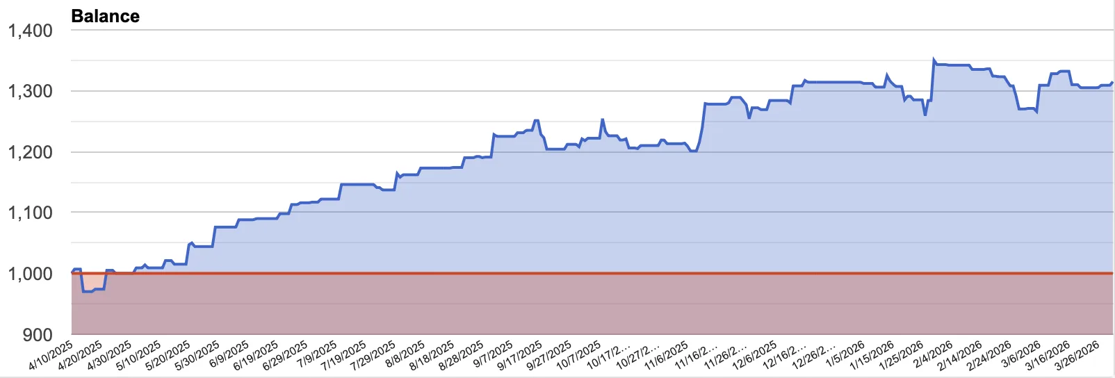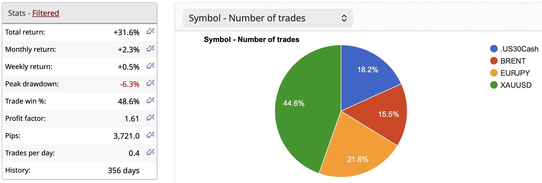 This matters because the portfolio is now cleaner, easier to monitor, and less dependent on one dominant market. The filtered snapshot currently shows total return +31.6%, monthly return +2.3%, weekly return +0.5%, peak drawdown -6.3%, win rate 48.6%, profit factor 1.61, 3,721 pips, and 0.4 trades per day over a 356-day history. In terms of trade distribution, XAUUSD accounts for 44.6% of trades, followed by EURJPY at 21.6%, .US30Cash at 18.2%, and BRENT at 15.5%.