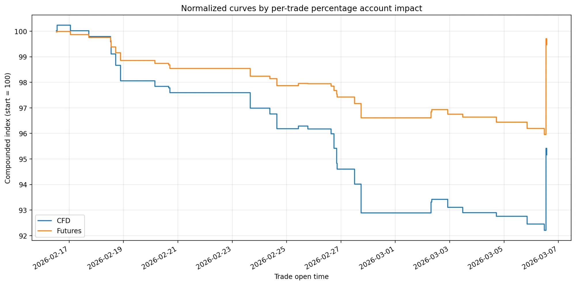 That fixed sizing explains why a small result on the CFD account can correspond to a much larger dollar PnL on the futures side. This is not automatically a copying error. It is part of the chosen exposure conversion.